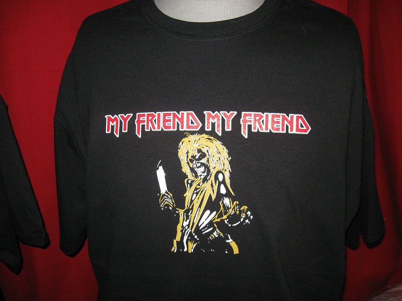 Once again...ask, and ye shall receive. I have gotten a lot of recent requests to re-run this one, so the time has come. Originally run in Nov/Dec of 2010, these are up again for a pre-order. This pre-order will run until Nov. 27th, and the shirts will ship out roughly 10 days after that. Please understand this is a pre-order situation, and your shirt will not ship out until after the pre-order closes.Modeled after the head shop metal shirts of the 80's and 90's, these My Friend shirts feature a three color front, and a one color back. The shirts will be black Gildan 100% cotton. (If you want to Google the styles of the shirts I use: Men's shirt-2000, Long Sleeve-2400, Ladies-64000L and Hoody-18500), The hoodies are a 50/50 blend.